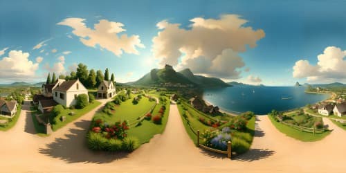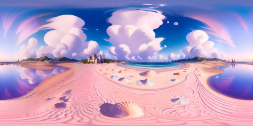 FantasyMasterpiece quality, ultra-high resolution VR360. Endless sandy beach landscape, scattered seashells, soft pastel hues in coastal dunes. Crystal clear water gently kissing the shore, soft reflections. Sky dominated by dreamy pastel clouds, cotton candy sunset. Romantic, impressionist-style VR360 scene.