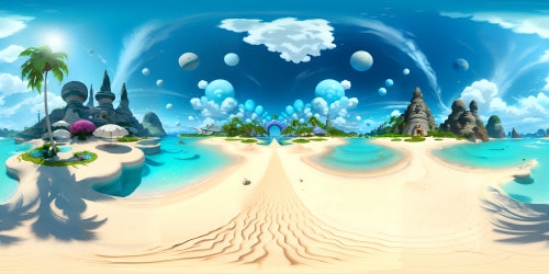 Pristine, white sand beach, aquamarine water shimmering under a radiant sun. Palms swaying at the edge, providing respite from the heat. Expansive, cloudless cerulean sky, compelling ocean horizon. VR360 ultra-high-resolution, immersion in a tropical paradise. Photorealistic, hyperreal detail, textures, tones. Sway of palm fronds, fine sand granules. A VR360 masterpiece, a