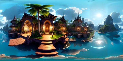 VR360 view of digital painting-style tropical paradise, ultra-high-resolution palms framing view, expressive brushwork, lush fronds, masterful shading. VR360 panorama of idyllic beach, majestic sunset hues contrast against silhouetted palm trees.