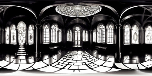 Pen & InkMasterpiece quality VR360 scene, ultra high res details. Focus on grand cathedral's exquisite stained glass, ethereal light streaming through. Contrasting, dark, intricately carved stone archways. Surreal art style, emphasis on color and texture contrast. VR360 view of vast, vaulted ceilings, intricate mosaic floor.