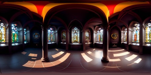 Masterpiece quality VR360 scene, ultra high res details. Focus on grand cathedral's exquisite stained glass, ethereal light streaming through. Contrasting, dark, intricately carved stone archways. Surreal art style, emphasis on color and texture contrast. VR360 view of vast, vaulted ceilings, intricate mosaic floor.