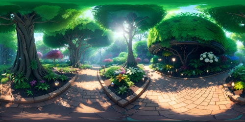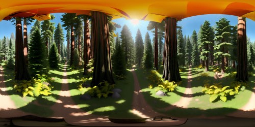 Stylized CGI RealismVR360 vision of lush forest, towering ancient trees, sun-dappled foliage, crystal-clear streams. Accents of blooming flowers, fern-carpeted forest floor. Majestic, ultra-high-res, akin to an animated masterpiece. Impeccable detailing, Pixar-style artistry in VR360 format.