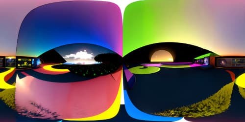 VR360 panorama, blazing sun mastery, fiery horizon spectacle, ultra-high-resolution. Cobblestone streets, sizzling, shimmering heat. Ice cream cones, drippy puddles, stark contrasts. White ice cream swirls, luscious, enticing texture, chilling counter to simmering ambience. Picasso-style, abstract yet intriguing VR360 artistry. Surreal, immersive, vivid melting