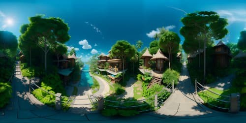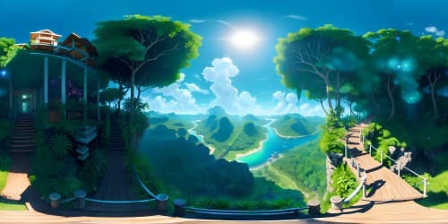 Masterpiece quality, ultra-high resolution, VR360 view, tropical rainforest skyline, lush canopy, Amazon River mirrored in sky, VR360 tropical palette, vibrant hues of green and blue