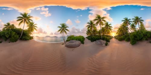 Masterpiece quality, ultra high-res Caribbean island, intricate sand patterns, lush tropical foliage. Azure ocean meeting the horizon, cotton candy clouds scattered across the sky. VR360 view brimming with vibrant, exotic flora. Pixar-style realism, soft, glowing light effects in the VR360 expanse. Tropical paradise.