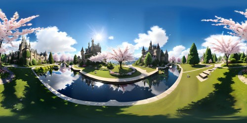Advanced (no style)Cherry blossom-lined castle towers, verdant Hogwarts grounds in spring, VR360 vibrant hues. Sparkling Black Lake, snow-capped mountains backdrop, rich ultra-HD detail. Masterpiece, fantasy art inspired, with a touch of realism. VR360 immersive, magical, lush atmosphere.