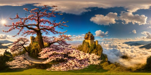8K-M3 Above the CloudsUnder a majestic blossoming tree in full spring bloom, magical birds flutter, an ancient wooden tower stands guard, a vibrant Ghibli-style castle dazzles in the distance, with detailed microtextures and 8K resolution, evoking a whimsical atmosphere of enchantment and fantasy.