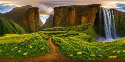8K-M3 Advanced (artistic)A breathtaking, vast highlands landscape in Ethiopia, showcasing terraced lush green valleys, cascading waterfalls, towering cliffs under a golden sunrise, punctuated with vibrant wildflower fields and dramatic cloud formations.