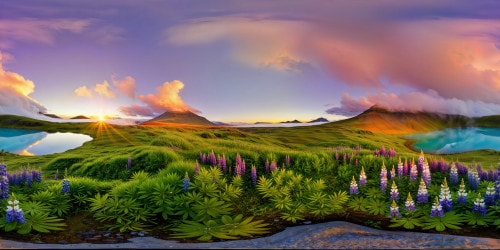 8K-M3 Detailed RenderIcelandsummer landscape quiet morning foggy mood crisp calm reflections in opaque bright aqua hot springs ponds across the landscape of tundra and lupine flowers with distant highland mountains beautiful sunrise over the open horizon