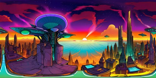 A breathtaking, flawless utopian cityscape at sunset, with towering crystal skyscrapers, holographic billboards, bustling hovercars, intricate futuristic architecture, and a spectacular technicolor sky that stretches endlessly.