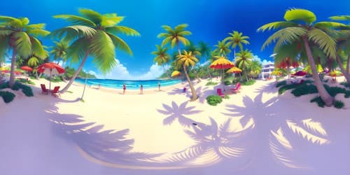 A serene beach scene with palm trees and surfers enjoying the waves under a colorful umbrella.