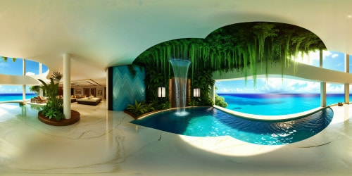 8K-M3 Concept RenderA flawlessly designed futuristic living space within a modern mansion, all white marble adorned with lush green plants, open ceiling with full view of sky, expansive windows offering a serene water garden with small cascading waterfalls, all under a vibrant aqua blue sky overlooking a tropical beach.