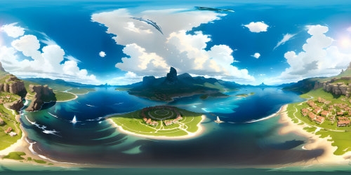 Enchanted PaintingMasterpiece, ultra-high res VR360 view, panoramic seascape at twilight. Merged horizon, cotton candy pink clouds. Crystal clear azure waters, flawless tranquility. Reflections of serene beauty, captivating wonder. A vivid VR360 panorama, delivering serene beauty, in breathtaking resolution.
