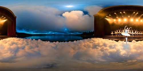 8K-M3 Above the CloudsCenter stage at a grand theater, the lead in Swan Lake flawlessly twirls in a pristine white costume under the dazzling spotlight, against an intricate stage set of a moonlit lake backdrop, creating a crystal-clear visage in ultra high resolution— a perfect masterpiece.