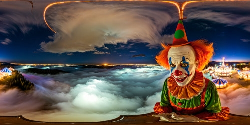 8K-M3 Above the CloudsAbandoned carnival grounds under a blood moon sky, Art the Clown's twisted face lurking in the shadows, neon lights flickering eerily, dilapidated clown statues, grotesque rides frozen in time, a masterpiece of terrifying beauty in flawless ultra high resolution.