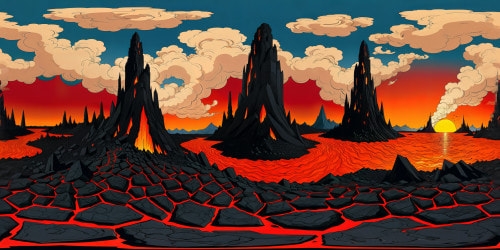 8K-M3 ComicA flawless, ultra high-resolution depiction of a vast, infernal landscape unfolds with sprawling jagged obsidian peaks, cascading rivers of lava, and billowing sulfurous clouds under a blood-red sky, punctuated by towering demonic citadels and tormented souls writhing in eternal agony, a masterful vision of hellish perfection.