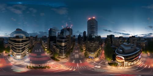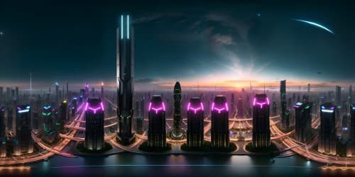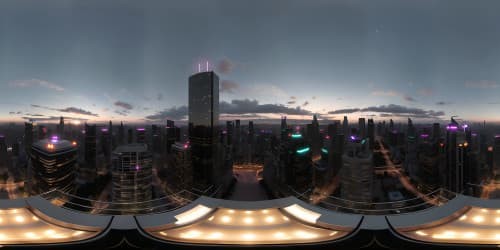 VR360 cyberpunk cityscape masterpiece, ultra high-res, neon-lit urban panorama. VR360 dystopian skyline, holographic billboards in the sky, towering megastructures, detailed architecture.