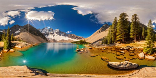 Awe-inspiring 12K 360-degree hyper-realistic panorama capturing a flawless, untouched natural paradise with dense verdant forests, glistening waterfalls, mirror-like lakes, majestic snow-kissed peaks, and a radiant sunset cloaking the entire vista in a golden glow, an unparalleled visual marvel of absolute perfection and intricate detail.