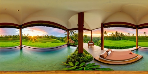 Luxurious villa nestled in Ubud, flawlessly designed with panoramic vistas of emerald rice fields, reflecting the golden hues of the sunset in stunning 8K resolution.