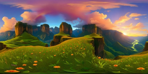 FantasyVR360 Ethiopian highlands, stepped green valleys, towering cliffs, sunrise glow. Wildflower carpet, twirling clouds, sky spectacle. Ultra-high-resolution, flawless execution, detailed masterpiece. Best-quality VR360, vibrant colors, captivating natural panorama.