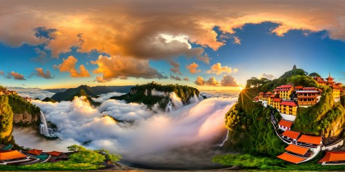 8K-M3 Above the CloudsA stunning, unrivaled hobbit village surrounded by vast, undulating emerald meadows, vibrant round doors, cozy lanterns casting a warm glow, meticulously detailed thatched roofs, wisps of smoke curling from charming chimneys, a breathtaking masterpiece in flawless ultra-high resolution.