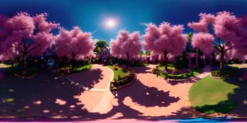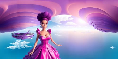 In this panorama image, amidst a purple rain shower, a Barbie doll stands out, exuding elegance and charm.