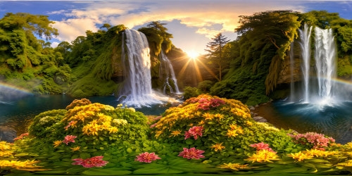 8K-M3 Above the CloudsAn idyllic, heavenly garden setting with cascading waterfalls, vibrant blooming flowers, golden sunlight filtering through lush trees, and a tranquil pond reflecting the flawless beauty of a graceful, elegant woman, her figure obscured by ethereal light and shimmering particles, enveloped in an aura of mystery and allure.