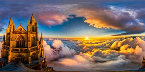 8K-M3 Above the CloudsA magnificent cathedral scene at dawn, exquisite stained glass windows casting ethereal light, towering spires reaching for the heavens, cloaked in a golden luminance, radiating divine presence and tranquility.