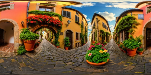 8K-M3 Above the CloudsAn enchanting alleyway lined with vibrant flowerpots, sunlight filtering through lush greenery, cobblestone pathway, charming old architecture, fluttering butterflies, poetic atmospheric lighting, inviting and tranquil.