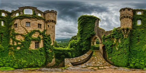 8K-M3 PhotorealOvergrown castle ruins rise majestically under a canopy of moody gray skies, every weathered stone and delicate tendril of ivy meticulously captured in ultra-high resolution, a sublime masterpiece of atmospheric detail.