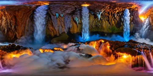 An immense crystalline cavern glowing with bioluminescent fungi, cascading waterfalls of molten silver, shafts of light piercing through iridescent mists in pristine 16K resolution, dazzling.