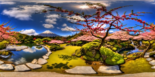 8K-M3 Above the CloudsA breathtaking masterpiece captured in ultra-high resolution, showcasing an idyllic Japanese cherry blossom garden at full bloom, with a serene koi pond reflecting the clear blue sky, fluttering petals in the gentle spring breeze, vibrant moss-covered stones, and distant mountains painting a perfect horizon.
