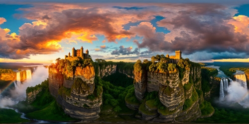 8K-M3 Above the CloudsA captivating, flawlessly detailed, high-resolution rendering of a majestic, ancient citadel atop a towering cliff, surrounded by cascading waterfalls, lush greenery, and a vivid sunset, a digital painting masterpiece.