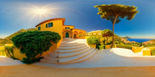 8K-M3 Open WorldAn immaculate, ultra high-resolution scene capturing a flawless Mediterranean yellow villa nestled atop a lush green hill, surrounded by a picturesque Mediterranean garden under a crystal-clear blue sky, evoking a perfect holiday atmosphere.