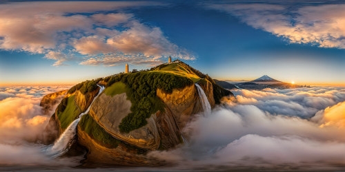A breathtaking, vast highlands landscape in Ethiopia, showcasing terraced lush green valleys, cascading waterfalls, towering cliffs under a golden sunrise, punctuated with vibrant wildflower fields and dramatic cloud formations.