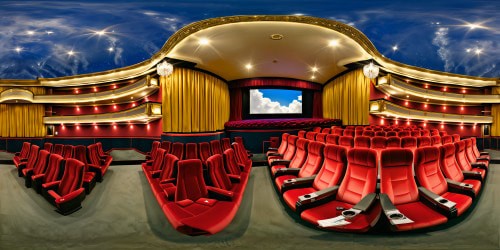 Classic movie palace ambiance, Amsterdam's Tuschinski inspiration, VR360 central seat perspective. Silver screen dominance, opulence abound, intricate detailing, plush textures. Luxurious aesthetic, ultra high-res, masterpiece rendering, VR360 richness. Classic cinema charm meets modern digital painting finesse.