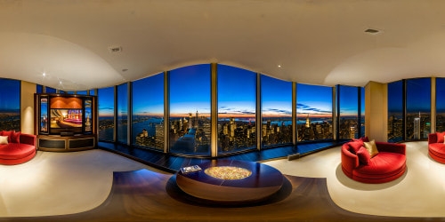 8K-M3 Above the CloudsSavoring a flawless, ultra high-res summer night from a luxurious penthouse in Manhattan, immersed in a 360-degree panorama, with a state-of-the-art personal movie theater showcasing modern furniture and decor.