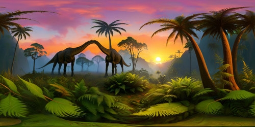 VR360 scene: Jurassic era landscape, towering ferns, colossal Brachiosaurus silhouettes, misty amber sunset. Ultra high-res visual, VR360 immersion in colossal scales. Artistry in style of grand realism, detailed fauna, nuanced lighting, masterpiece-quality rendering.