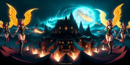SciFifive evil female angels wearing black leotards with red trim_they have golden wings_the women have gold halos over their heads_one woman has dreadlocks_two of the women are african american_they are flying_one woman is carrying a flaming green hammer.