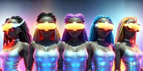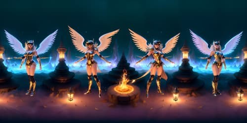 Stylized CGI Realismthree female angels wearing white leotards with gold trim_they have golden wings_the women have gold halos over their heads_one woman has dreadlocks_two of the women area african american_