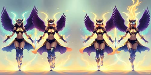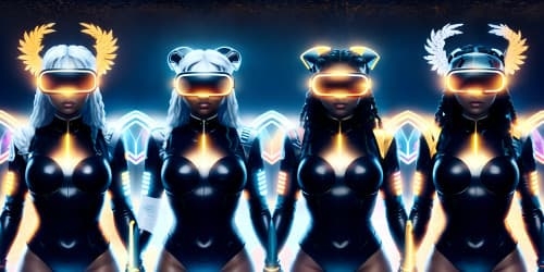 Cyberpunkthree female angels wearing white leotards with gold trim_they have golden wings_the women have gold halos over their heads_one woman has dreadlocks_two of the women area african american_
