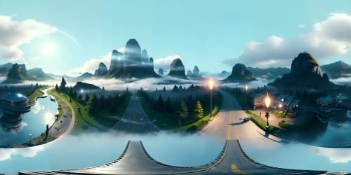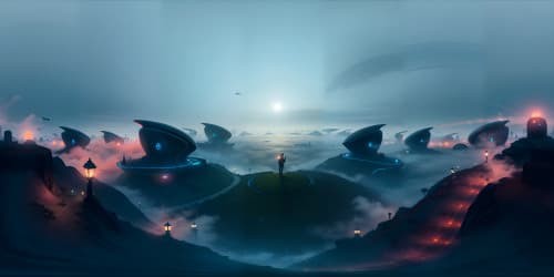 In this foggy gothic scene, an eerie atmosphere pervades as shadows dance among ancient architecture.