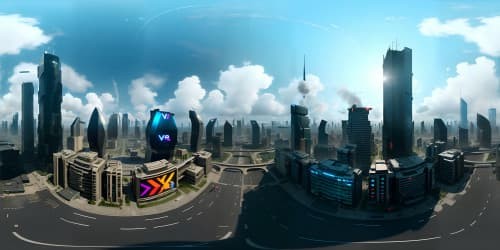 In this cyberpunk cityscape, anime-inspired buildings and neon lights create a futuristic atmosphere.