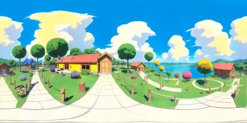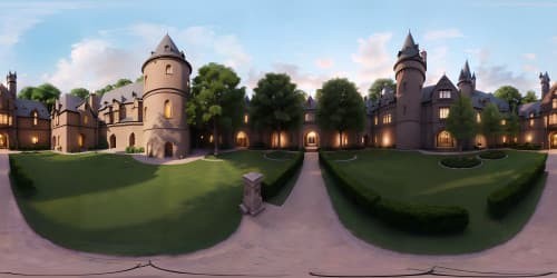 In this panorama image, the scene depicts a beautiful sunset over a school, creating a peaceful and nostalgic ambiance.