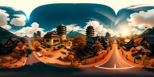 In this picturesque scene, magnificent Japanese temples stand majestically amidst serene mountains, creating a tranquil and serene atmosphere.
