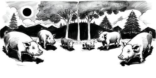 five pigs wearing tophats and darkglasses eating ham sandwiches pen and ink
