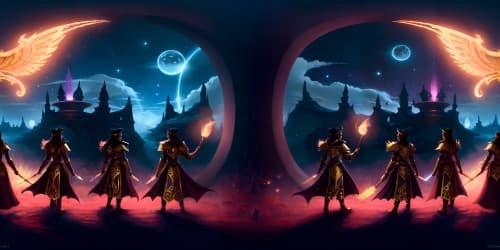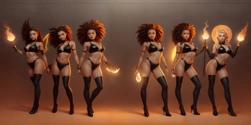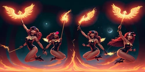Digital Paintingfive female angels wearing red leotards with gold trim_they have golden wings_the women have gold halos over their heads_one woman has dreadlocks_two of the women are african american_they are flying_one woman is carrying a flaming green hammer.