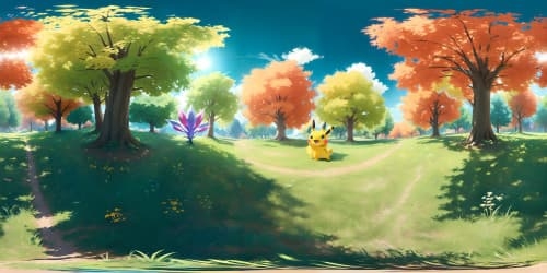 In this panoramic image, we see Pokemon gathered on a vibrant grass field, creating a captivating and lively scene.