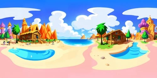 In this panorama image, the scene showcases a beach with people enjoying the sun and water, especially in bikinis.