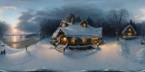 The panorama image shows a snowy beach with a beautiful seaside view.